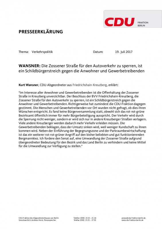 Im Interesse aller Anwohner und Gewerbetreibenden ist die Offenhaltung der Zossener Straße in Kreuzberg unverzichtbar. Der Beschluss der BVV Friedrichshain-Kreuzberg, die Zossener Straße für den Autoverkehr zu sperren, ist ein Schildbürgerstreich gegen die Anwohner und Gewerbetreibenden. Richtigerweise hat zumindest die CDU-Fraktion dagegen gestimmt. Die Menschen und Gewerbetreibenden vor Ort wurden nicht gefragt, ob dies ihren Wünschen entspricht. Es fand keine Bürgerversammlung statt, obwohl sich das rot-rot-grüne Bezirksamt öffentlich immer für mehr Bürgerbeteiligung ausspricht. Der Verkehr wird durch die Sperrung nicht weniger, sondern er wird sich nur in andere Kreuzberger Straßen verlagern. Viele andere Kreuzberger werden dadurch mehr Verkehr erleiden müssen. Die Gewerbetreibenden beklagen, dass der Umsatz sinken wird, weil weniger Kundschaft zu ihnen kommen wird. Neben der Einführung der Begegnungszone und der Parkraumbewirtschaftung ist das ein weiterer rot-rot-grüner Angriff auf den bisher beliebten und gut funktionierenden Bergmannkiez. Ich fordere den Senat auf, eine Umwandlung der Zossener Straße aufgrund übergeordneter Bedeutung für den Bezirk und das Land Berlin zu verhindern und keine Mittel für die Umwandlung zur Verfügung zu stellen.