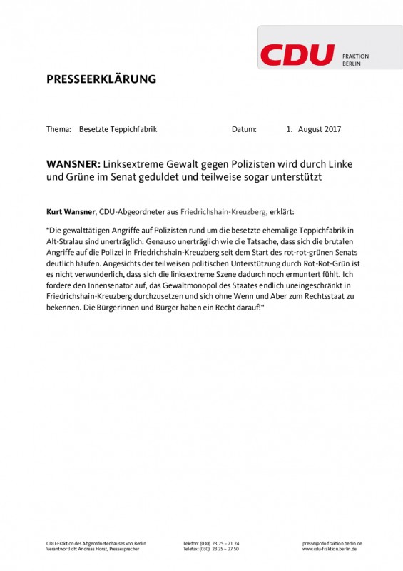 “Die gewalttätigen Angriffe auf Polizisten rund um die besetzte ehemalige Teppichfabrik in Alt-Stralau sind unerträglich. Genauso unerträglich wie die Tatsache, dass sich die brutalen Angriffe auf die Polizei in Friedrichshain-Kreuzberg seit dem Start des rot-rot-grünen Senats deutlich häufen. Angesichts der teilweisen politischen Unterstützung durch Rot-Rot-Grün ist es nicht verwunderlich, dass sich die linksextreme Szene dadurch noch ermuntert fühlt. Ich fordere den Innensenator auf, das Gewaltmonopol des Staates endlich uneingeschränkt in Friedrichshain-Kreuzberg durchzusetzen und sich ohne Wenn und Aber zum Rechtsstaat zu bekennen. Die Bürgerinnen und Bürger haben ein Recht darauf!“
